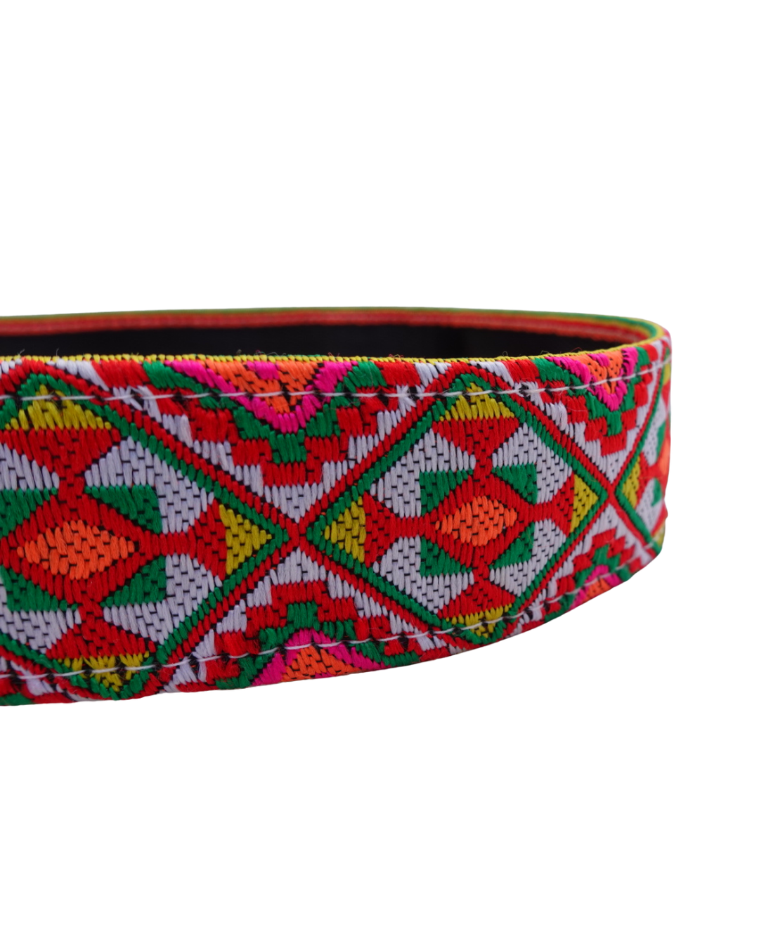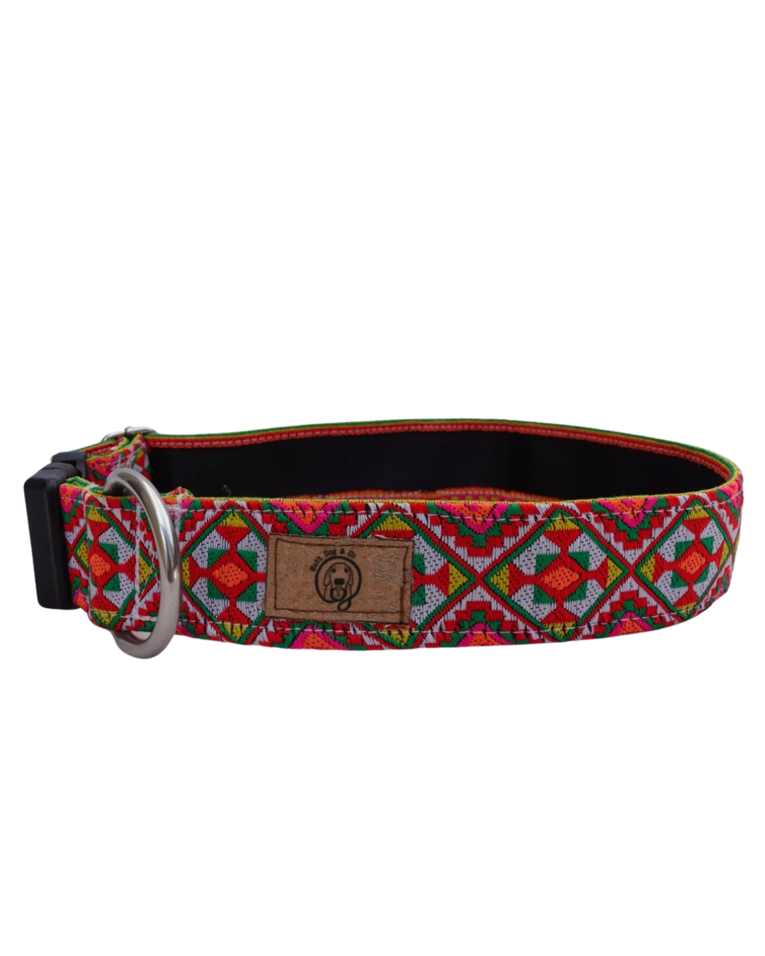 Coleira de cão ajustável feita à mão com padrão étnico.