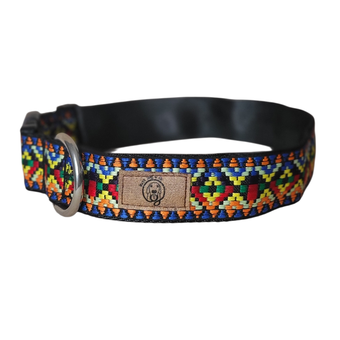 Coleira ajustável feita à mão com padrão étnico azul, branco, laranja, verde, encarnado