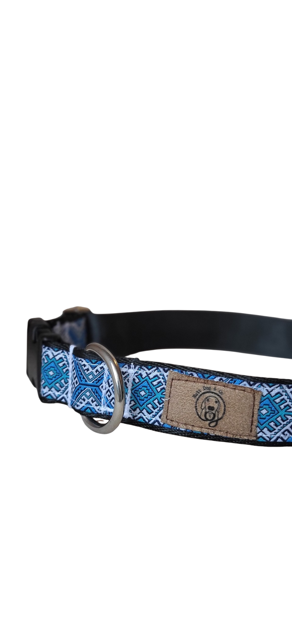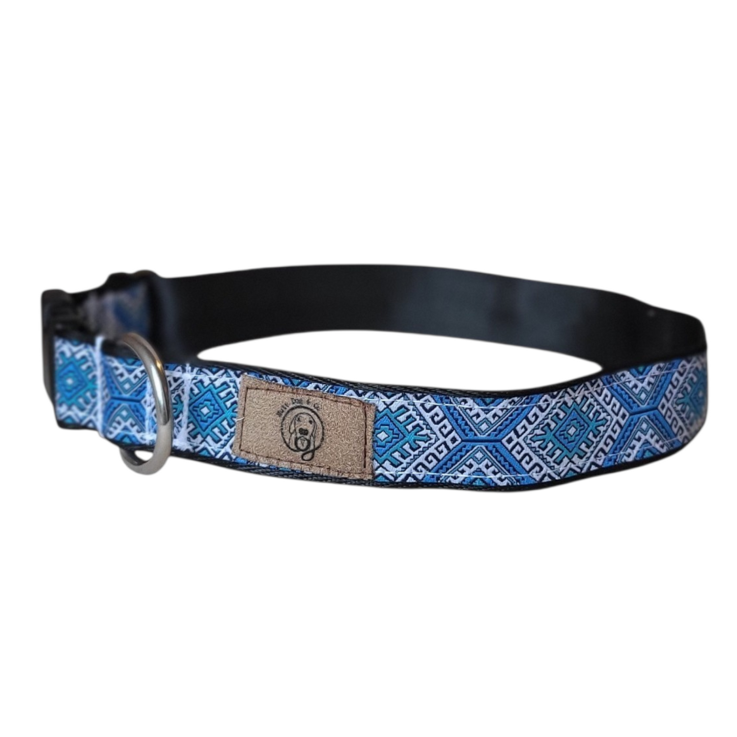 Coleira ajustável feita à mão com padrão étnico azul, verde e branco