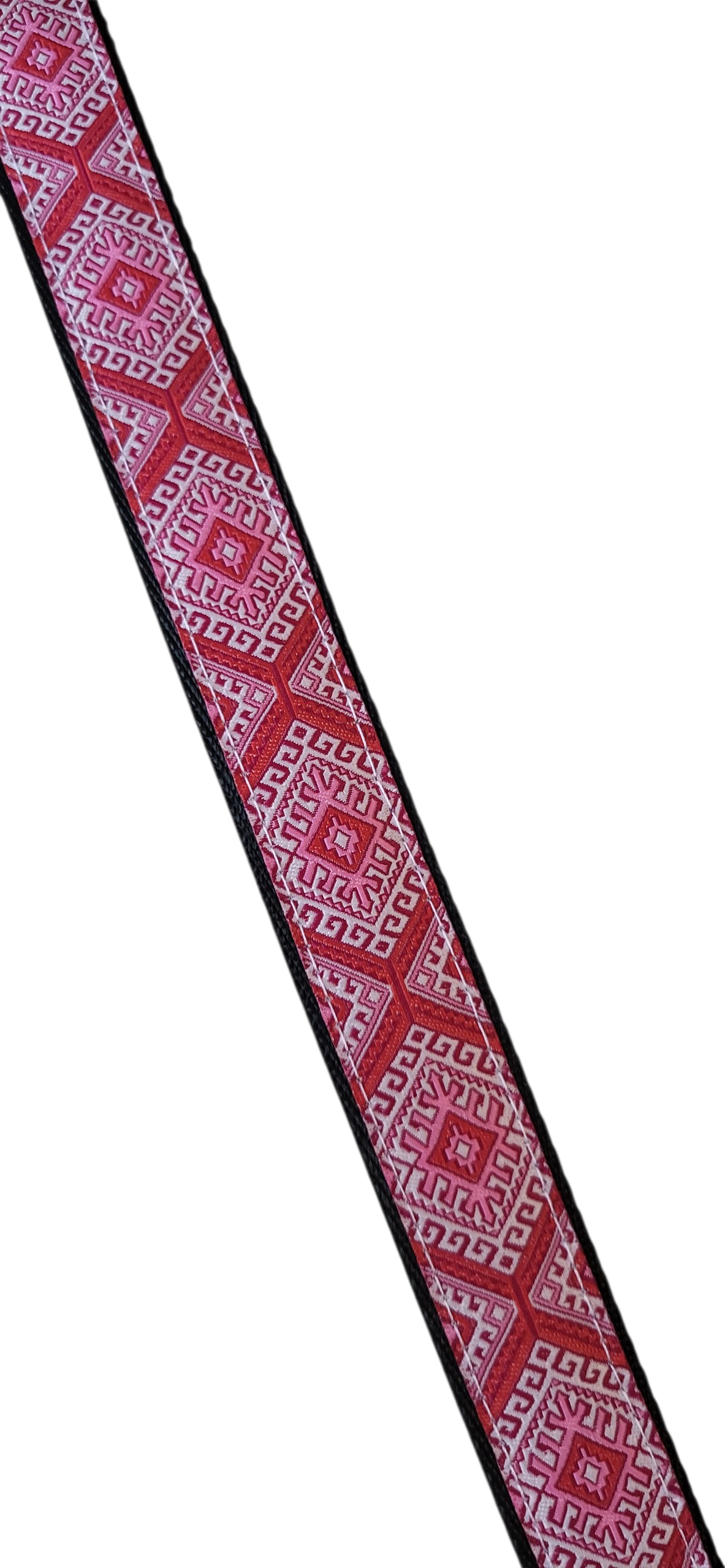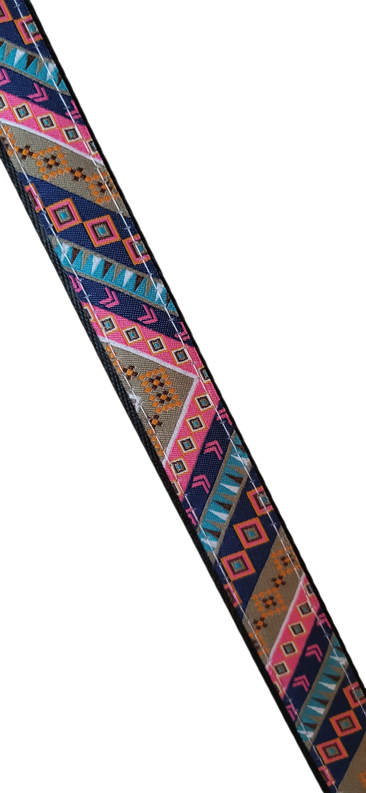 Alça de mala é feita à mão com padrões étnicos e coloridos. Assim como as coleiras dos seus cães.