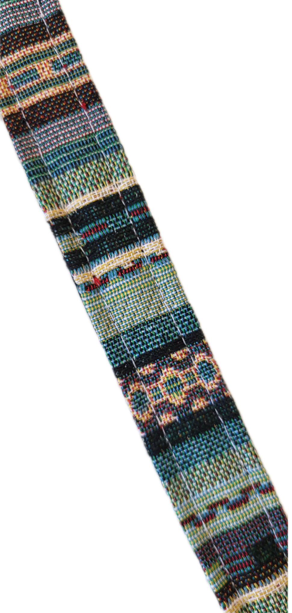 Trela feita à mão com padrão étnico azul, verde e amarelo.