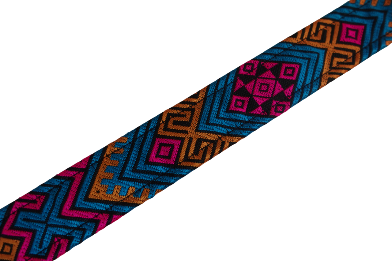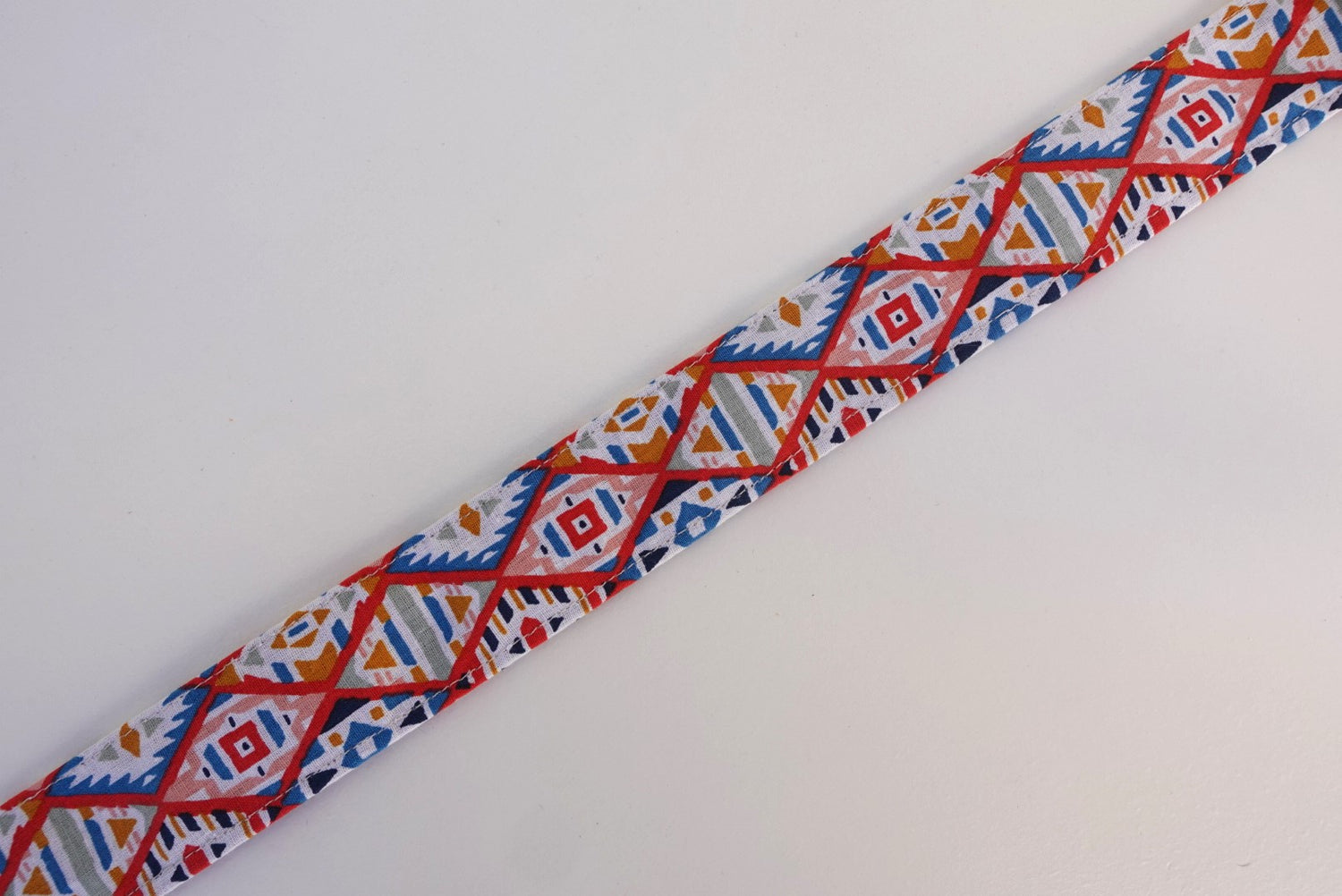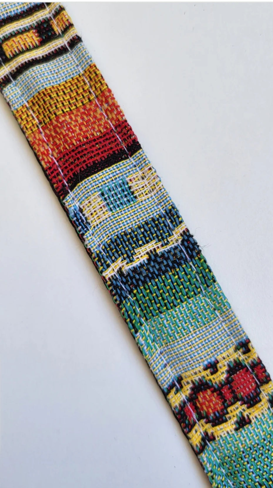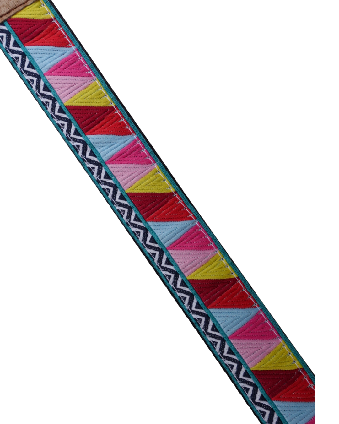 Alça de mala é feita à mão com padrões étnicos e coloridos. Assim como as coleiras dos seus cães.