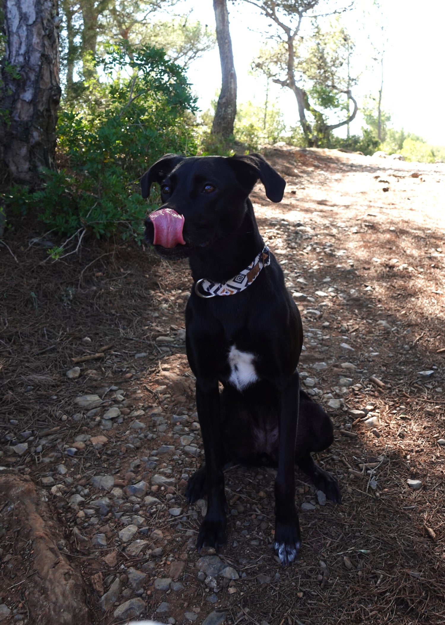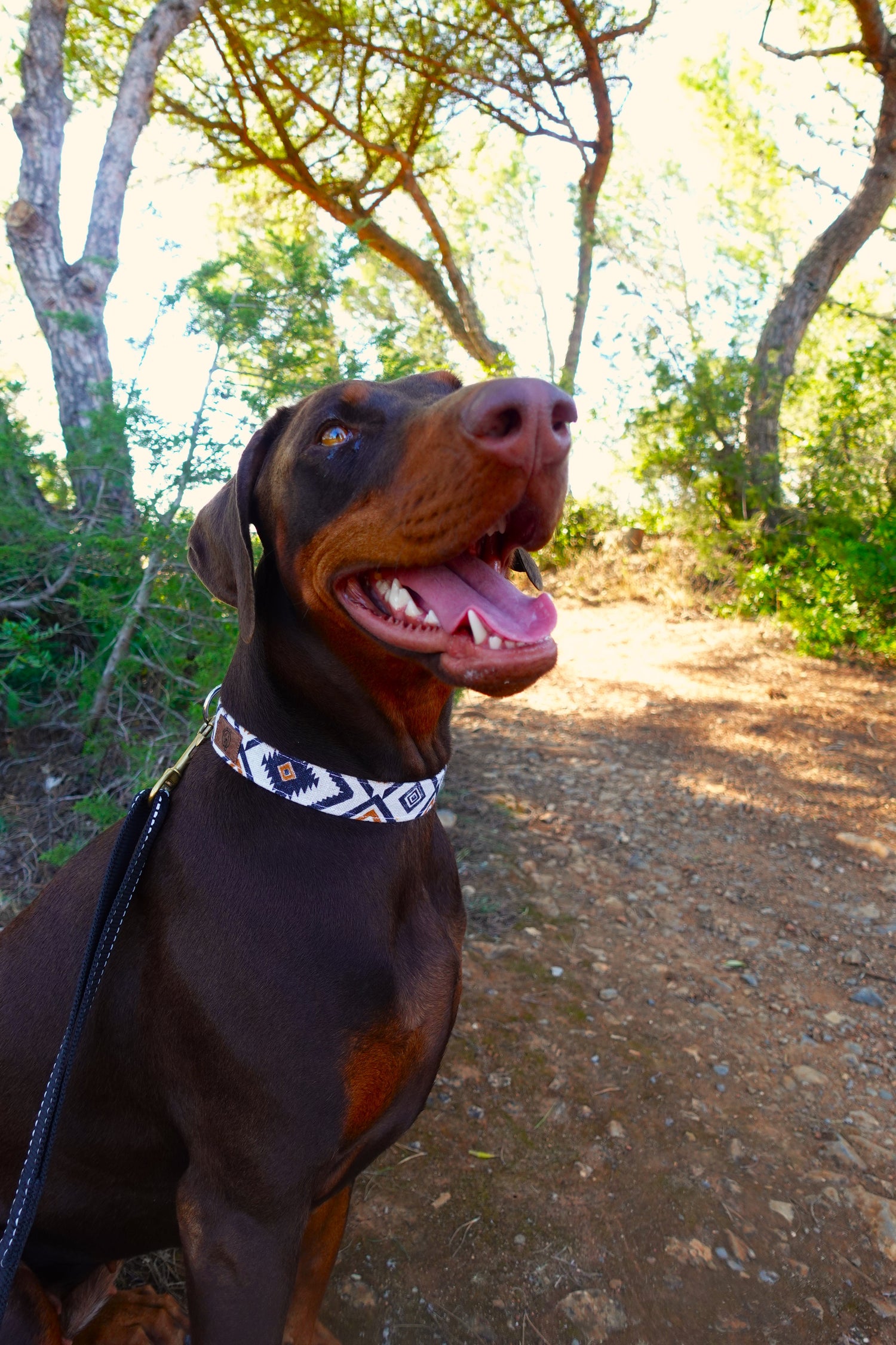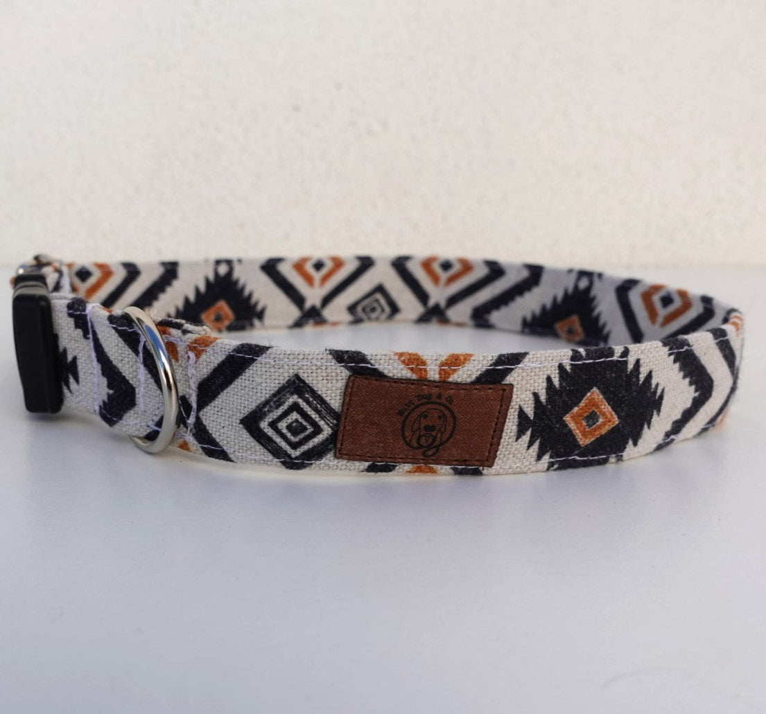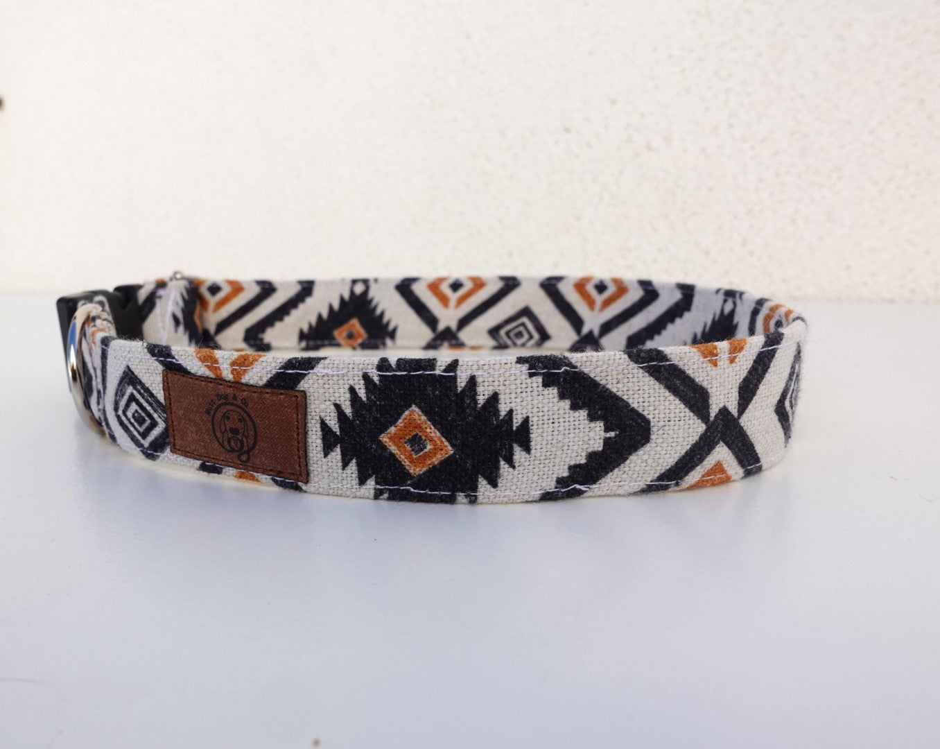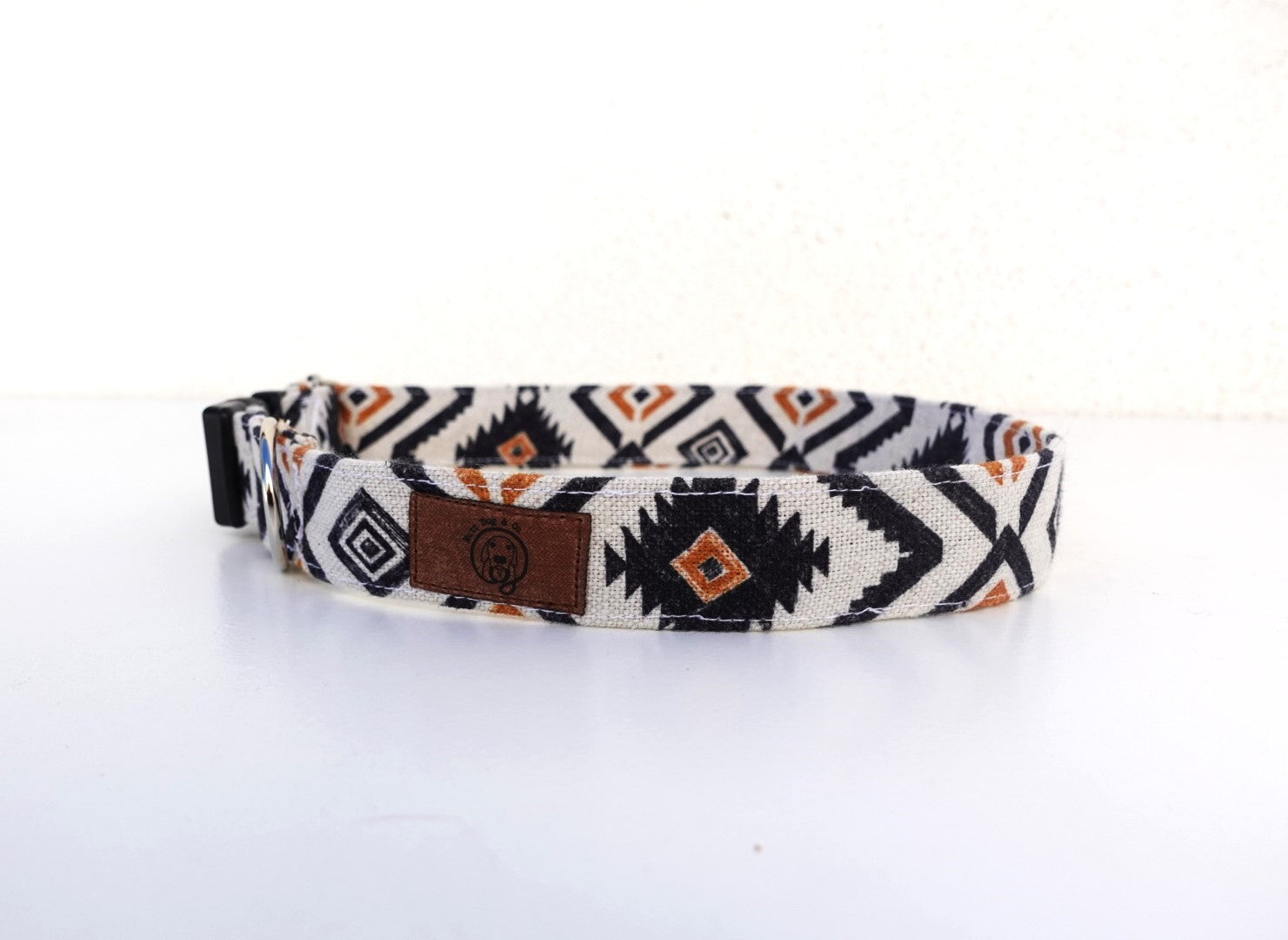 Coleira de cão ajustável, feita à mão, com padrão étnico em branco, azul, amarelo.