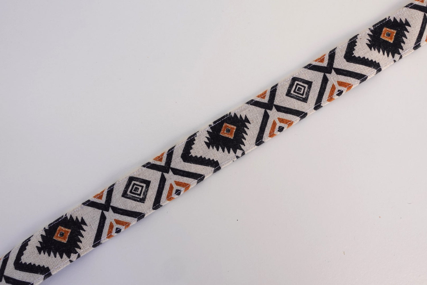 Trela feita à mão com padrão étnico azul, amarelo e branco.