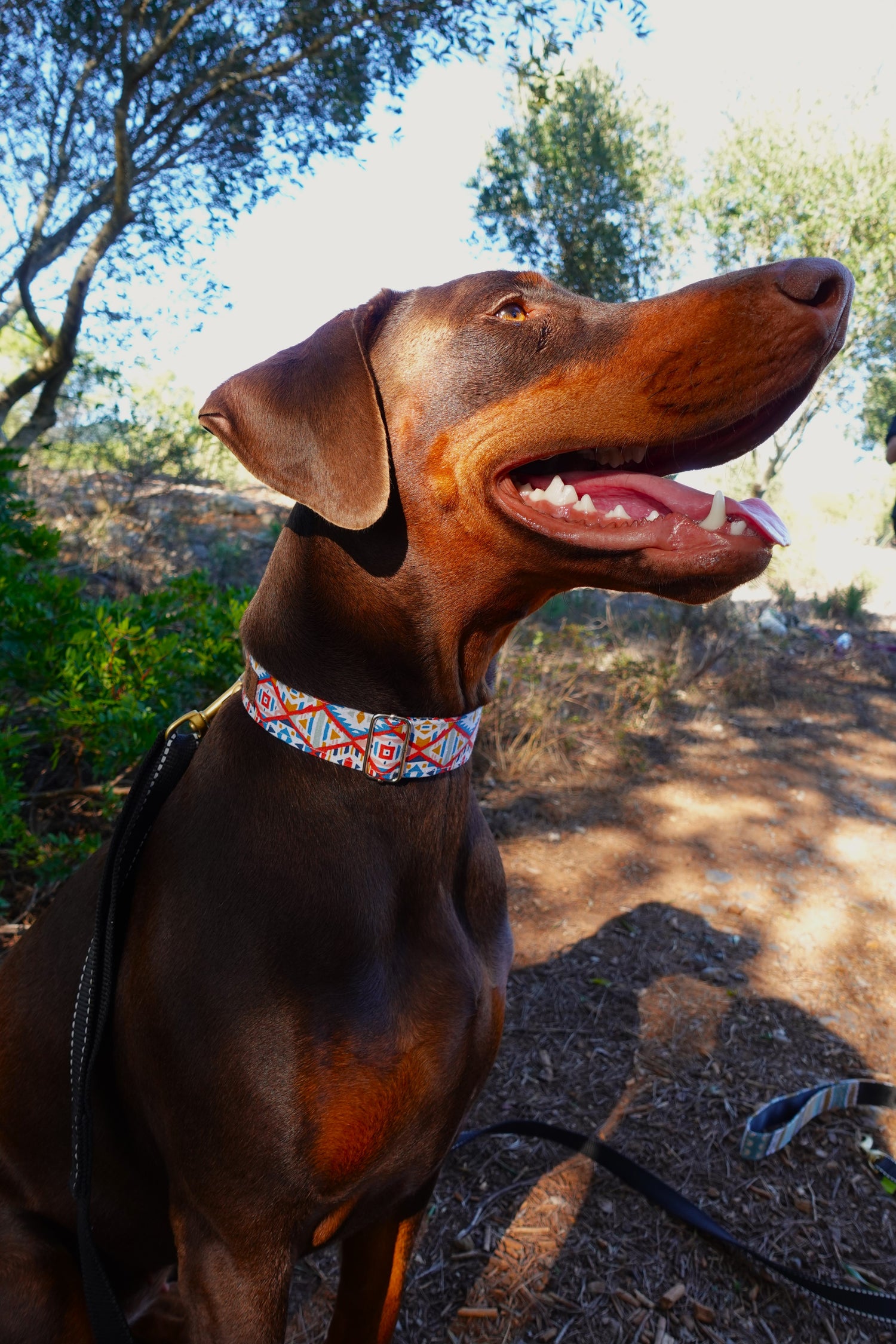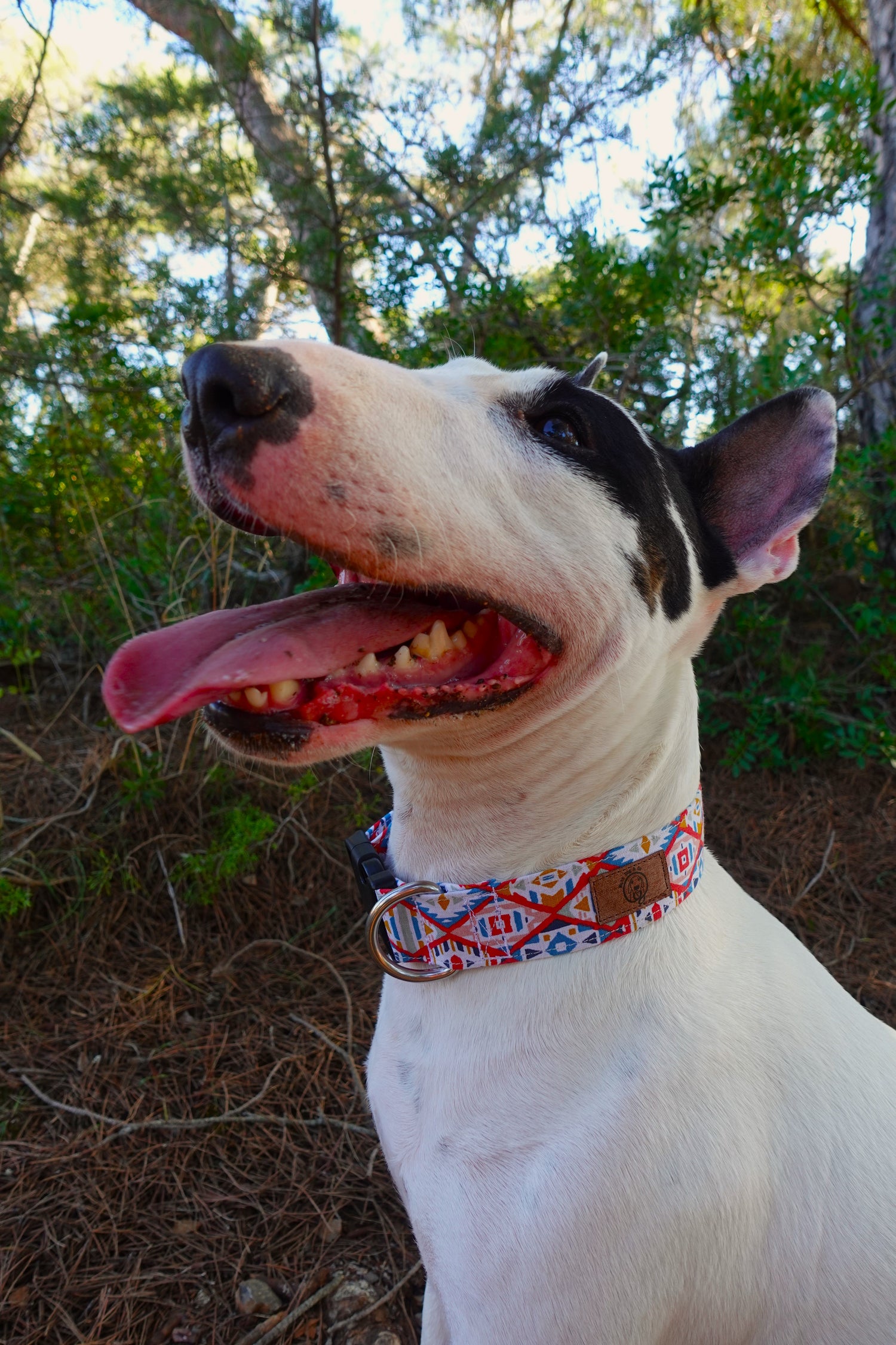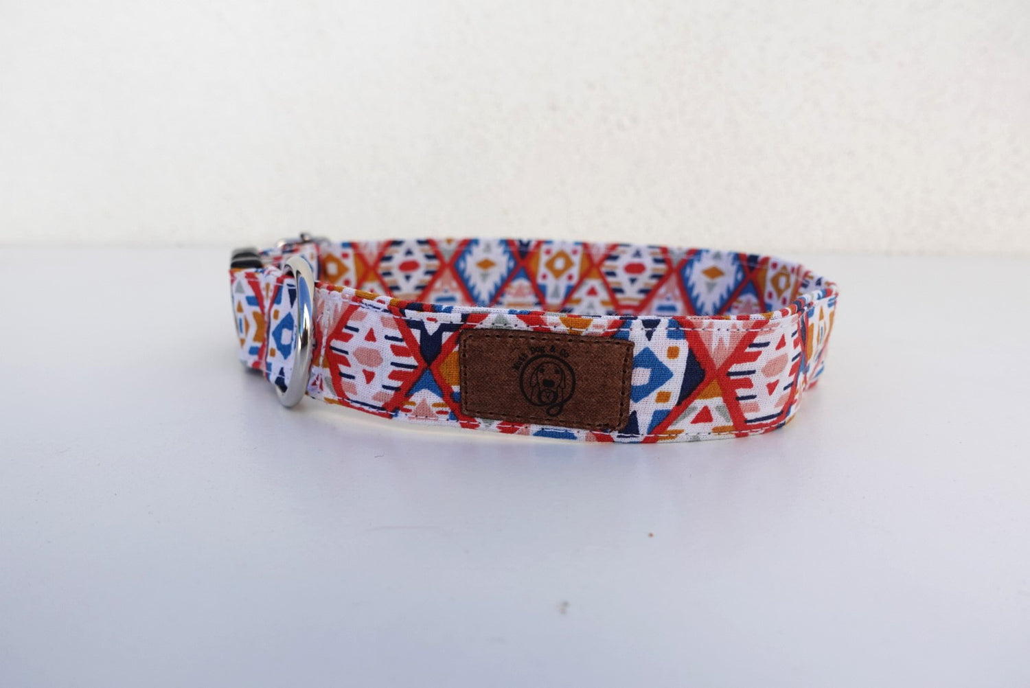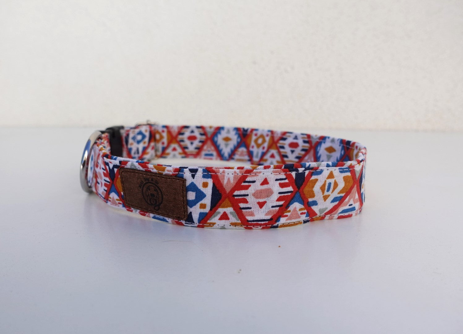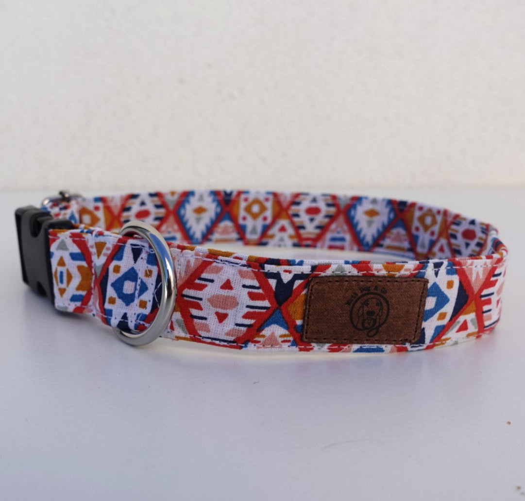 Coleira de cão ajustável, feita à mão, com padrão étnico em azul, encarnado, branco e laranja.